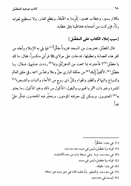 كتاب فكّر المعروف بتوحيد المفضل ، أملاه الإمام أبوعبدالله الصادق عليه السلام
