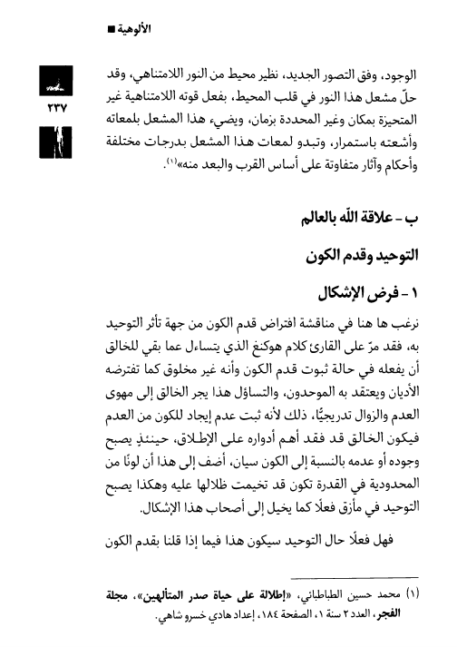 نام کتاب : كبريات المشكلات العقلية ، المعرفة والنفس والألوهية في الفلسفة الإسلامية والمدارس الفلسفية الأخرى نویسنده : محمد بن رضا اللواتي جلد : 1 صفحه : 237